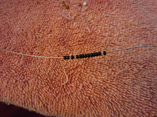 Now let's get started! Threading beads with wire is easy. You just insert the end of the wire into the seed bead opening. Here's where your pattern comes into play. For the first (meaning the bottom) row, thread the entire count of beads onto the wire and let them fall all the way to the center of the wire.